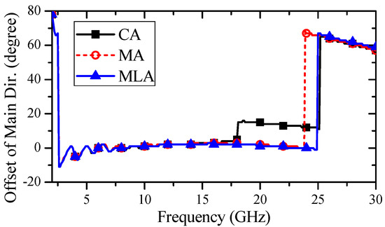 Figure 9 gives the offset between the main lobe direction and the end-fire direction for the three PWTSAs. It can be found that the offset of the CA increases to 15° in the frequency band above 18 GHz, which indicates the shifting and splitting of the main lobe in the high frequency band. After loading a metallic delay lens in the MA, the position of the offset jump is delayed from 18 to 23.9 GHz. Moreover, based on the loading of the metallic delay lens and the airy acceleration region, the position of the offset jump for the MLA is further pushed with the offset being confined to 2° until 24.9 GHz, which indicates that the loaded metalens can improve the radiation stability of the PWTSA dramatically.