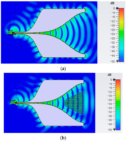 The contours of the electric field at 20 GHz in the E-plane for the unloaded reference CA and the MLA with a metalens are illustrated in Figure 10a,b, respectively. It can be seen that the electric field of the MLA shows a flatter wavefront than that of the unloaded CA, which means that the loading structures play an effective role in the gain enhancement of the PWTSA.
