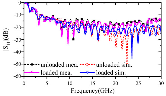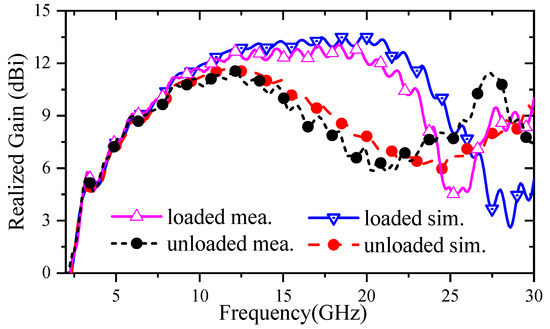 The realized gain of the proposed loaded PWTSA and the unloaded reference PWTSA were measured and compared with the simulated ones, as shown in Figure 13. Based on the simulated results, the realized gain of the PWTSA was improved in the range from 9 to 26 GHz with a maximum enhancement of 6.4 dB at 20.9 GHz by loading the metalens, while the measured results of the loaded PWTSA showed an enhancement of 0.5–6.2 dB from 7.32 to 24 GHz with a maximum quantity of 6.2 dB at 20.4 GHz. Therefore, the improvement of the gain provided by the loading metalens for the PWTSA in the high frequency band is dramatical, though the enhancement and the corresponding frequency band given by simulation and measurement are slightly different in specific values. In addition, there is a mismatch between the simulated results and the measured results in the high frequency band, mainly due to the loss of the SMA connector and antenna installation in measurements. These effects for the measured results are especially obvious at high frequencies, above 10 GHz.