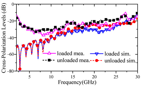 Figure 14 shows the cross-polarization levels of the loaded PWTSA and the unloaded reference PWTSA based on the simulation and the measurement. It can be seen from the measured results that the cross-polarization levels of the loaded PWTSA are below −20 dB across the band of 2.8 to 25.9 GHz, which is lower than that of the unloaded one, especially in the high frequency band. It means that the loading of the metalens is not deleterious to the cross-polarization level when enhancing the gain of the PWTSA.