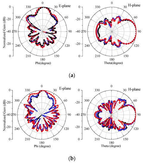 From the discussion given in previous sections, the phase adjustment by the metallic delay lens and the airy acceleration region is more effective in the high frequency band because the phase difference in the aperture surface is larger in this band. It can be verified by comparing the radiation performance between the three antennas shown in Figure 8 and Figure 9.