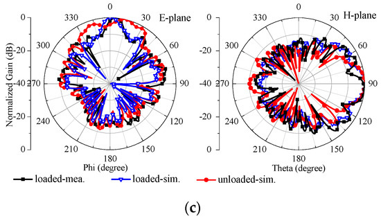 The normalized radiation patterns of the proposed loaded PWTSA obtained in measurement and simulation are found in good agreement, as shown in Figure 15. To verify the loading effect of the metalens, the simulated radiation patterns of the unloaded reference PWTSA is also shown in Figure 15. It can be found from Figure 15a that the radiation patterns of the two PWTSAs are almost the same at 10 GHz both in the E-plane and the H-plane. Along with the increase of the frequency, the 3 dB main lobe width in the E-plane is narrowed and the side lobe level (SLL) is decreased slightly for the loaded PWTSA, while the main lobe of the unloaded PWTSA is shifted and broadened with large SLLs, as shown in Figure 15b,c. The detailed comparison of the radiation patterns between the two PWTSAs is shown in Table 1, which demonstrates the gain enhancement and the preferable radiation stability performance by the loading of the metalens for the PWTSA.