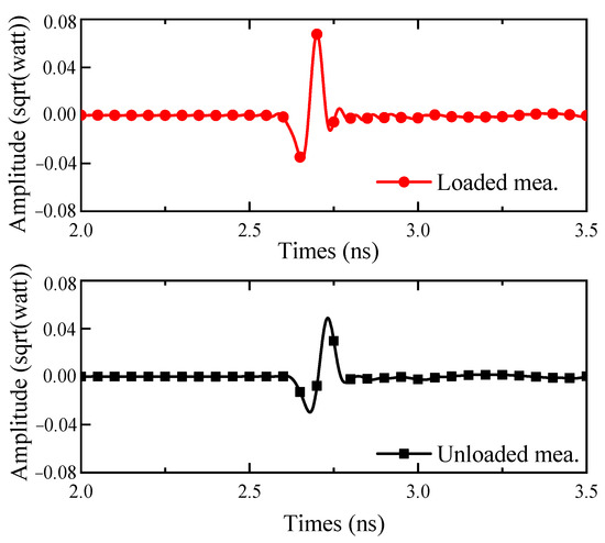 To investigate the time-domain performance of the proposed antenna, two identical loaded PWTSAs were placed 0.5 m apart along the end-fire direction and the transmission signal under the co-polarization condition were measured by using a vector network analyzer. For comparison, the same setup and measurement were made for the unloaded reference PWTSAs. A Gaussian pulse with a spectrum from DC to 30 GHz was utilized as the excitation. Figure 16 gives the measured transmission signals of the loaded antenna system and the unloaded one. It can be seen that the two signals present similar waveforms with a differential Gaussian main pulse and a small tailing effect. It means that the metalens shows a negligible effect on the waveform distortion, which has been discussed in Section 2. Therefore, the proposed loaded PWTSA can be viewed as a good candidate for short-pulse applications.