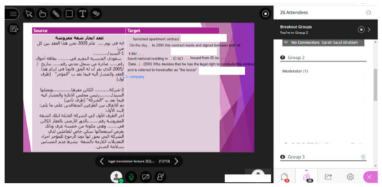 Collaboration between learners may be noted throughout the literature as having a positive impact on learning. This is especially the case on courses that involve a high level of thinking and problem-solving skills [1] such as translation courses. In these instances, learners may prefer to collaborate traditionally by meeting face to face, but due to the pandemic, this was not possible. Instead, all learning was transferred online, with classes continuing in various online environments, known as virtual learning environments (VLEs), wherein learners could only collaborate via the virtual world. The most commonly used VLE in Saudi universities is Blackboard. This is a learning management system (LMS) with tools for developing a collaborative environment, such as breakout groups. Breakout groups enable learners to be allocated to different groups, whereupon they continue to work alone, while collaborating virtually with fellow group members. They cannot see the activities of other groups, but the teacher can enter each virtual room and check the learners’ performances. On this basis, the present study explored the extent to which learners in a translation class find breakout groups on Blackboard useful and easy to use for working collaboratively in an online environment. An attempt will, therefore, be made to answer the following questions: