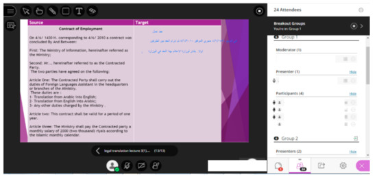The participants were all taught by the same teacher and covered the same material during both classes. The students met their teacher twice a week for three hours. On the Translation course, different types of texts were studied and translated throughout the 12 weeks of teaching, for example, political, medical, financial, and law texts. Breakout groups were created for the classes. Here, the learners practiced translating texts such as tenancy agreements. In the first class, these law texts were translated from Arabic (the source text) to English (the target text). Meanwhile, in the second class, the students translated from English (the source text) to Arabic (the target text).
