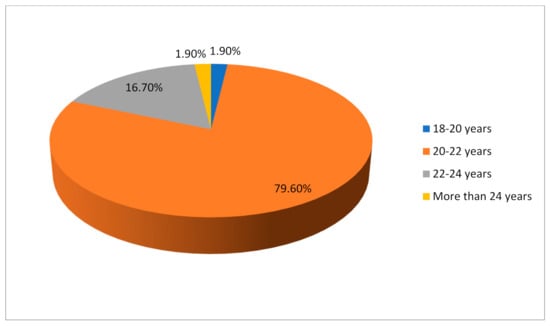 The following, Table 2, illustrates that the percentage of sampled participants aged between 18 and 20 years was 1.9%; 79.6% of the sampled participants were aged between 20 and 22 years; 16.7% were aged between 22 and 24 years; 1.9% were aged over 24 years. Figure 3 below illustrates percentages for age for the participants.