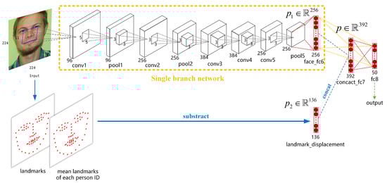 This method combines the visual and geometrical information in an end-to-end convolutional neural network (CNN) [22,30]. First, each face ID’s mean landmarks were estimated. Then, the geometrical representation of landmarks displacement is extracted. The visual features are extracted by modified AlexNet [42], and the geometrical features are represented as the face landmark displacement. In this way, both the geometrical and the visual information are fully utilized for emotion recognition.