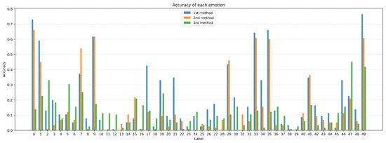 Apart from multimodality network with visual and geometrical information, other baselines such as unsupervised Learning of CNN [45] and face alignment images trained with inception-V3 model and center loss [46] can be used. For the 50 labels as shown in Table 2, the baselines for the aforementioned three methods’ accuracy of each category of emotion on the testing set of the iCV-MEFED dataset is shown in Figure 3.