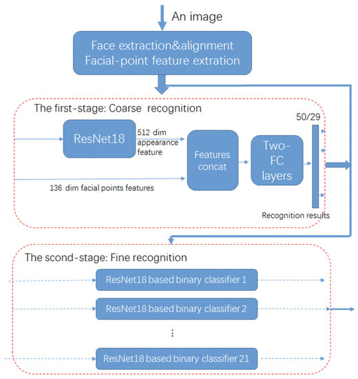 The proposed two-stage recognition method (shown in Figure 4) includes a coarse recognition and a fine recognition, respectively, in the first-stage and in the second-stage. A preprocessing is also included to crop and align the face regions from the images to reduce the computational overhead.