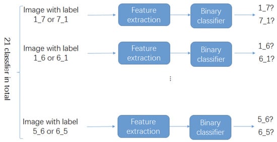 From this confusion matrix, it was found that a large proportion of false-detections occur between the symmetrical emotions such as angry–surprised and surprised–angry (red circle (28%) in Figure 5). This motivated the winners to use a second stacked recognition stage to enhance the recognition of such symmetrical emotions. In this stage, firstly, they cluster the symmetrical labels such as (, ) together; after that, 50 labels are clustered to 29 labels. In these 29 labels, there are 21 symmetrical labels, since there are 8 labels in which the complementary emotion label and the dominant emotion label are the same. Then, features were extracted and a binary classifier was trained for each symmetrical label, which helped mitigate the error caused by the symmetrical labels. In this stage, symmetrical emotion samples were used to train the classifier. The feature extractor and the binary classifier used in this stage are similar to the methods used in the first stage. A ResNet18-like backbone is used to extract the appearance features between the symmetrical emotions. Then, the same fully connected structure is used as the binary classifier. However, in this stage, a sigmoid function is used in the last layer instead of a softmax function. Thanks to the fine recognition in this stage, recognition performance improved while the false cases caused by symmetrical labels are better handled. Figure 6 summarizes this procedure.