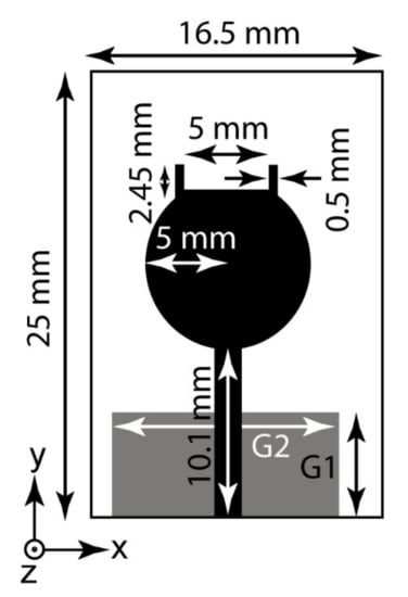 Figure 1 shows a diagram of the unit cell for the orthogonal MIMO antenna. Initially, a circular patch with a radius of 5 mm attached to a 10.1 mm-long feed line was etched on a partly ground (6.25 × 13.5 mm2) TMM4 laminate with a thickness of 1.524 mm, εr = 4.4 and tan δ = 0.02. The simulations were carried out in Ansys High-Frequency Structure Simulator (HFSS). A wideband impedance match from 3.8 GHz to 12.6 was obtained as depicted in Figure 2. If the radius of the circular patch is increased, a good impedance match at the lower band could be achieved, but this could affect the coupling in the MIMO configuration. To achieve a wider bandwidth, the top side of the circular patch was modified with vertical stubs of dimensions 2.45 × 0.5 mm2. The optimized vertical stubs caused an increased current density on the surface of the overall radiating patch. Consequently, the matched impedance bandwidth increased on both the lower and higher sides of the earlier achieved band, and thus a UWB of 10.7 GHz from 2.9 to 13.6 GHz was achieved.