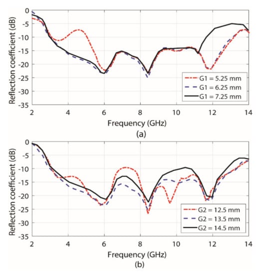 In addition to other antenna parameters, a fragmentary ground plane was introduced beneath the transmission line to alter and reconfigure the surface current density. The inclusion of this partial ground plane affected the impedance matching and consequently the S-parameters. It is observed that the overall bandwidth of the reflection coefficient reduced when the width of the ground (G1) is decreased or increased from 6.25 mm. As shown in Figure 3a, decreasing G1 affects the lower frequency band while increasing G1 affects the high frequency band. On the other hand, the length of the ground (G2) has no impact on the unit cell’s total bandwidth. However, as shown in Figure 3b, it influences the magnitude of the matched impedance. Based on these findings, the partial ground was optimized as 6.25 × 13.5 mm2 to better accommodate the UWB.