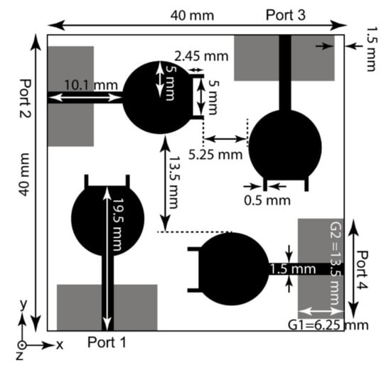 Recently, authors have presented a miniaturized four-port antenna for UWB, 11 and 13 GHz frequency bands with an overall attained bandwidth of 10.5 GHz (3 to 13.5 GHz); however, the mutual coupling was around −15 dB, ECC was around 0.4 and CLL was 0.22 bits/s/Hz []. The proposed design was initiated using the same patch and later modified to obtain the desired results of −16 dB mutual coupling and 90% efficiency over the wider bandwidth without compromising the overall physical size of the antenna. The larger size of the radiating patch of a unit cell in [] causes greater current flow and unwanted interaction between the adjacent elements of the proposed MIMO antenna. This consequently increases the mutual coupling and efficiency of the MIMO antenna. Moreover, with the excess current on the edges of the square patch, the MIMO antenna could cause electromagnetic interference with the rest of the integrated RF circuitry in an electronic device. This could affect the overall efficiency of the device. So, the reciprocal of the square patch attached on the edge of the circular patch to enhance the bandwidth is required, but carefully, as it deals with the enhancement of the bandwidth of the proposed MIMO antenna in [].