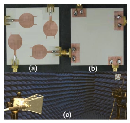 The four-port MIMO antenna was then designed by using the unit cell presented in Section 2. Four cells in close vicinity were mounted using reciprocal orthogonal geometry, as shown in Figure 4. The distance between two radiating patches was kept at 5.25 mm. Figure 5a,b illustrate the antenna prototype, while Figure 5c illustrates the experimental setup to measure different antenna parameters. The prototype was etched on 1.524 mm-thick TMM4 laminate (εr = 4.4 and tan δ = 0.02) using a LPKF ProtoMat S64 machine and SMA connectors were soldered to measure the antenna performance.