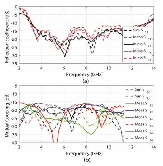 The simulated and measured S-parameters of the MIMO antenna are shown and compared in Figure 6. Figure 6a depicts the measured reflection coefficients at all four ports and simulated S11 for port 1 only. The rest of the simulated parameters are like S11, so are not shown in pictorial view for the sake of clarity. Although a slight shift in simulated and measured S11 at lower frequencies is observed, it remains below −10 dB throughout the proposed wideband.