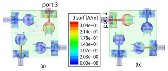The current density of an antenna is an important parameter for demonstrating polarization diversity phenomena. To demonstrate it, one port at a time was excited and the rest of the ports were terminated with the matched load; current density at 5.5 GHz is shown in Figure 7. Figure 7a shows that y-directed linearly polarized current vector lines reside around the TL and edges of the circular patch if port 3 is excited. However, when port 2 is excited, x-directed linearly polarized current vector lines with equal magnitude around the same geometry corners are observed. This clearly indicates polarization diversity among the elements of the MIMO antenna. The excellent separation between the elements in proximity is due to these orthogonally polarized current vectors.