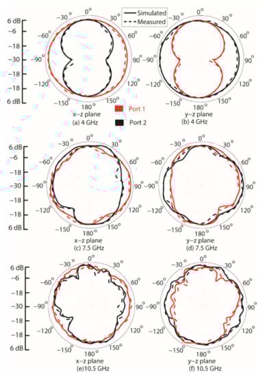 To validate this fact, radiation patterns of ports 1 and 2 were analyzed in the x–z and y–z planes at different frequencies. Figure 8c shows the radiation pattern of the two ports in the x–z plane at 7.5 GHz, whilst Figure 8d shows this pattern in the y–z plane at the same frequency. However, the patterns are not of a uniform shape like at 4 GHz in Figure 8a,b, i.e., omni-directional or dumbbell shaped. The reversal of the pattern in different planes is observed clearly. The pattern of port 1 in the x–z plane is the pattern of port 2 in the y–z plane, and vice versa at 7.5 GHz as well, which strengthens the phenomenon of polarization diversity. Moreover, the radiation patterns of ports 1 and2 at 10.5 GHz, the maximum frequency attained, in the x–z and y–z planes were also analyzed in Figure 8e,f. It is reported that the patterns of a port in the respective plane is an exact inversion of the patterns of the other port in the same plane at 10.5 GHz. At higher frequencies, discrepancy in the measured results is slightly more than the simulated results due to fabrication tolerance, connector losses, soldering and cable losses.