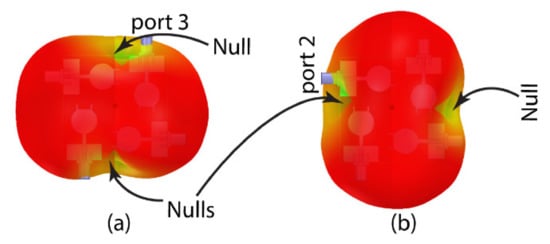 Next, to foster the discussion, a 3D radiation pattern at 3.5 GHz is plotted in Figure 9. It is observed that, when port 3 is excited, then the nulls and maximums of the resultant radiation pattern are exactly orthogonal to the nulls and maximums when port 2 is excited, as shown in Figure 9a,b. At the points where port 3 has the minimum points, port 2 has the maximum points and vice versa, so the resultant patterns are completely uncorrelated. Hence, the phenomenon of polarization diversity is validated through 2D and 3D radiation patterns at different frequencies.