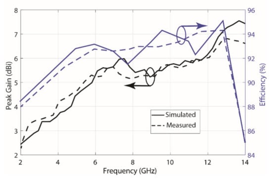 Furthermore, peak gain and efficiency of the antenna for the entire frequency band is reflected in Figure 10. The average gain of 4.5 dBi with more than 90% efficiency is reported for the entire spectrum to confirm the antenna functionality in the UWB region.