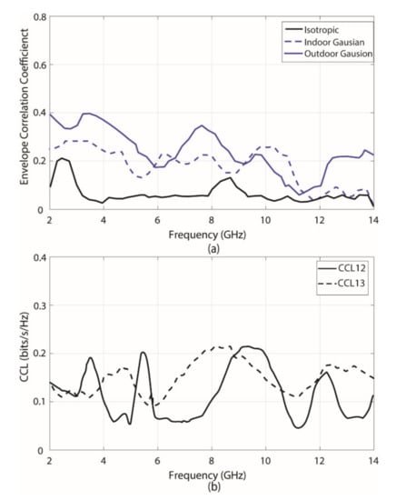 In the expression above, XPR stands for the cross-polarization ratio, while and are θ and components of the angular density functions of an excited wave. Figure 11a depicts the calculated ECC values for the entire frequency spectrum for isotropic, indoor, and outdoor Gaussian. The far-field characteristics in a uniform scattering environment were utilized to calculate the isotropic case, whereas the far-field radiation characteristics in a complex environment were used for the indoor and outdoor Gaussian. The fact that the computed ECC values for the isotropic case are less than 0.13, while the values for the indoor and outdoor Gaussian are less than 0.26 and 0.38, respectively, demonstrates the antenna polarization diversity once again.
