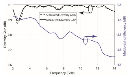 Channel Capacity Loss (CCL) is another way to measure the importance of a MIMO antenna. The CCL of ports 1 and 2 and 3 and 4 versus frequency is shown in Figure 11b. The overall computed CCL between the respective ports is less than 0.21 bits/s/Hz, indicating that there is a very little interaction between any two adjacent ports. Furthermore, Figure 12 shows the diversity gain and multiplexing efficiency across the entire spectrum, demonstrating the diverse MIMO antenna functionality. Throughout the claimed frequency range, the diversity gain is stated to be about 10 dB, while the multiplexing efficiency is greater than −3.5 dB.