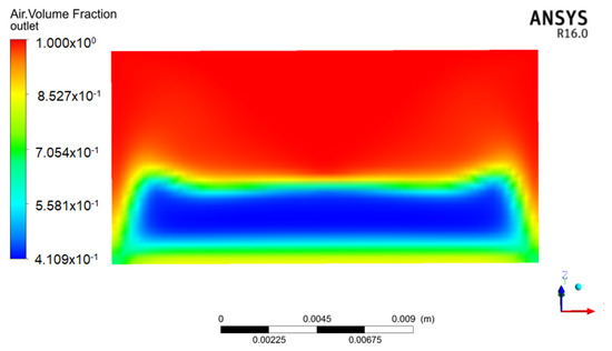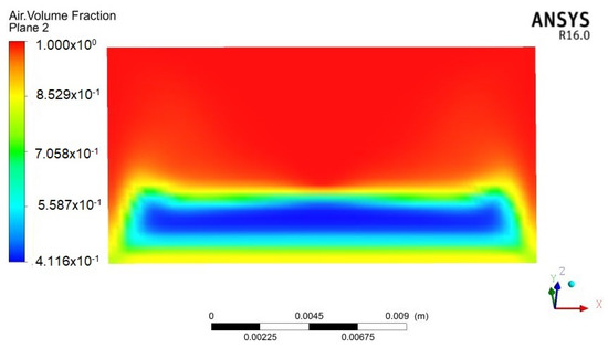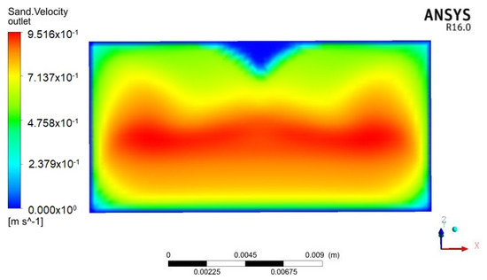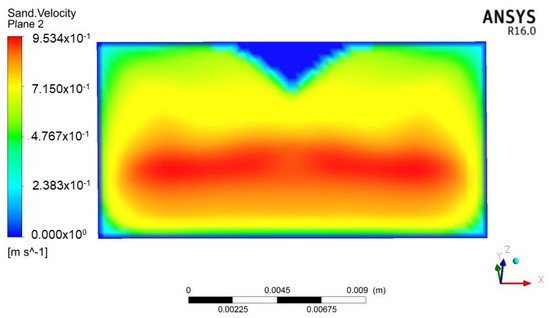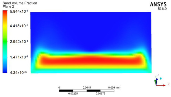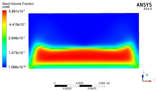 The air velocity is significant in the dense phased solid particles region. Notably, in the location where the air and solid particles interact, the air molecules accelerate due to the flow of solid particles, and the velocity of 0.94 m/s exceeds the inlet velocity of 0.47 m/s. However, as it proceeds further towards the top wall, the velocity decreases, as shown in Figure 3. It is evident from Figure 4 that under the influence of gravity, the solid particle settles at the bottom wall. As a result, the significant portion of the plane occupied by the air volume fraction varies from 41% in the dense phased solid powder region to approximately 100% in the plane. The velocity and volume fraction profile of the solid particles at plane 2 is shown in Figure 5 and Figure 6, respectively. The concentration of the particles sliding in an inclined plane is maximum at the bottom surface, at 58.8%. The reason is the effect of gravity [33]. However, a negligibly low concentration of particles is suspended in the space of the plane. The velocity in the highly concentrated region is 0.73 m/s and further accelerates up to 0.95 m/s in the area of the air–solid interaction, as shown in Figure 6. Figure 7 and Figure 8 show the air velocity and volume fraction at the outlet, respectively. The volume concentration of the air at the bottom surface is 41.09%. The concentration in the rest of the plane is close to 100%. However, a regular, well-defined velocity pattern follows by air at the outlet. The velocity is maximum in the center, 0.89 m/s, and decreases as it moves upwards in the channel. Figure 9 and Figure 10 show the velocity and the volume fraction of sand particles in the outlet (sand particles act as solid particles in the given scenario). It is clear from Figure 10 that the volume fraction of sand particles along the lower surface is 58.91%. A negligibly low concentration of the solid particles is suspended in the remaining plane, which is carried away by air.