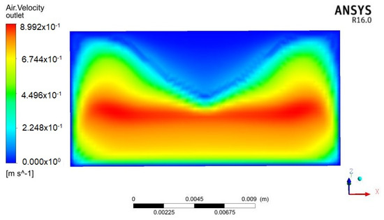 Similar to the air velocity profile, the solid particles also exhibit a well-defined regular pattern of the velocity profile, as shown in Figure 9. The region of the air–solid interaction offers the maximum velocity of 0.951 m/s. However, the suspended negligible small concentration of the particles shows a comparatively low velocity, as shown in Figure 9. Therefore, their impact on the mass flow rate measurement is ignorable since its concentration is too low. Numerical simulation of pneumatic flow is important to the visualization of solid flow [34]. Choking flow pipes and ducts because of cohesiveness is a big issue in the process industry [35,36]. Simulation results show the effect of gravity on the movement of the particles. However, the concentration of the suspended particles was low compared to the sliding particles at the bottom surface, but the moving air tends to suspend the solid particles. Based upon Figure 6 and Figure 10 from the simulation analysis, we observed that the volume fraction and the velocity of the solid particles do not remain constant along the z-axis. Instead of using a circular channel, a rectangular channel was used to ensure that all the velocity and volume fraction variations are within the upper and lower surface. Additionally, the electrodes of the electric sensors will be attached to the lower and upper surfaces to guarantee that particles must flow between the electrodes only [37].