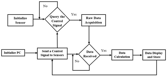 It is a more accurate force sensor since the alloy-steel structure and unique dimensions of load cells contribute to their ability to withstand shock loads above its maximum measuring capability. The load cell is also protected from irreparable damage as a result of excessive loading. The load cell employed in the suggested design has a resolution of 1 g and can measure up to 500 g. Different measurement ranges are possible for load cells. However, there is a trade-off in terms of sensitivity. For the purpose of improving weight measurement accuracy, high-value strain gauges with accuracy flexions are employed. The load cell is affixed to a lower side of the channel under observation. Its use is to determine sand mass that exists along the channel’s length—the load cell is connected to the computer via the integrated circuit HX711. Load cell and capacitive sensors’ data are time-synchronized, allowing for accurate measurements [33]. Figure 12 illustrates the measurement technique’s flow chart. PC software, capacitive sensor circuits, and load cells initialize, and then a control signal is sent through microcontrollers to Eval-AD7746EBZ and HX711 simultaneously.