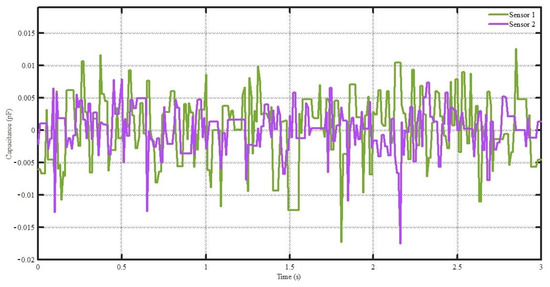 Capacitance values for the sensors were calculated as sand particles pass over the channel. Sensor 1 has an average value of 0.5229 pF, while sensor 2 has an average value of 0.4597 pF. Additionally, the amplitude of sensor 1’s variation in capacitance values is significantly greater than sensor 2’s variation in capacitance values [34]. While the rate of change remains the same, the pattern of variation in capacitance stays constant, consisting of a time delay. The difference of amplitude in mean readings and the variation of capacitive values are because sensor 1 is near twice the dimension of sensor 2. However, the comparison in the behavior indicates that whole sand flowing from the first sensor is likewise flowing with a temporal delay through the second sensor.