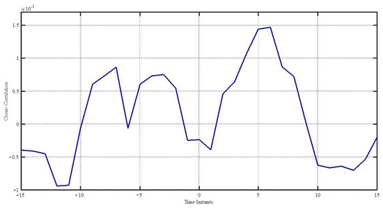 where is the mean value of all output signal samples during the duration of the timeframe. The cross-correlation function between the normalized outputs of the sensors is calculated using Equation (2). A frame length of ±15 instants and a sample interval of 10 ms are used when setting the sampling rate.