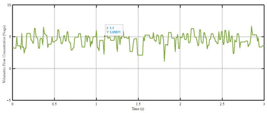 We used Equation (16) and the capacitance variation data from the first sensor for sand particles flowing through the channel, and calculated volumetric flow concentration of sand particles as shown in Figure 15. Only a very low concentration of sand particles (β < 10%) was present in the channel. For example, employing Equation (1) and values for = 2600 kg/m3, = 4 cm2 (4 × 104 m2), and = 1.916 m/s ( = K = 1.9844 kg/s), the MFR is given by Equation (17):