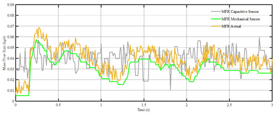 The actual MFR, , modeled as electrical sensor MFR output, , is shown in Figure 19, and the relationship between them is given by Equation (19):