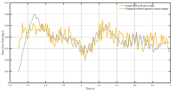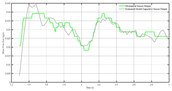Using Equations (6) and (9), the relationship between the sensors and the relationship between the real MFR and the sensor’s output was found using MATLAB R2018a. The linear modeling between the electrical, and mechanical sensor, outputs using Steiglitz-McBride’s iteration is given by Equation (18) and is shown in Figure 18.