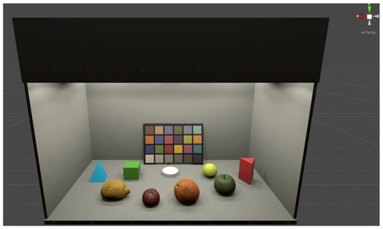 The aim of the work has been to develop a system capable of introducing spectral information on previously scanned objects. For this purpose, we simulated an LED light booth (Just Normlicht) with 12 LED spotlights []. Inside that light booth we included several fruits, 3D geometrical figures and a Color-Checker (X-rite) chart. The colors of these 3D objects were chosen to have well-known basic hues (red, orange, yellow, green and blue). The reason for not including any blue fruit or food was the difficulty of obtaining it. To complete the chromatic rainbow we included 3D geometrical figures (one blue) and a 3D capture of an original ColorChecker chart that provide us several important colors at daily-live like (brown, pink, purple and mid-tones). In the light booth simulation, we can switch between different light sources (TL84 and simulators of A, D50 and D65 illuminants).This means that the color of the objects shown at the virtual light booth will be calculated and represented in relation to the chosen light source. In our hypothesis, this allows the user to obtain a more faithful image of the displayed scenario and its components. The representation of 3D objetcs with hyperspectral textures, previously presented as preliminary work [], will improve the graphical representation of the virtual scenario. Figure 1 shows the initial representation of the project created in the virtual reality system.It shows a ColorChecker, a caps with an absolute white diffuser (Labsphere, North Sutton, NH, USA), four fruits and four geometrical figures.