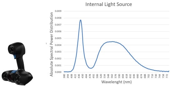 In order to achieve the structure of the real objects, we used a 3D scanner. We scanned them with a Go!Scan 20 3D scanner (Creaform, Levis, QC, Canada) and processed the 3D object model with VXscan and VXelements 4 software (Creaform, Levis, QC, Canada). This scanner has a resolution of 0.5 mm and an accuracy of 0.100 mm. With this device we can capture the geometry of an object with good representation; however, the color representation is not good enough. Together with the point cloud that defines the geometry of the object, this scanner provides an image file with the RGB color texture associated with the 3D object. To obtain that texture, this device employs an RGB CCD camera and an internal dual peak LED light source with a color temperature of 5000 K. In order to add the spectral information to the RGB texture provided by the 3D scanner, we developed a MATLAB script that calculates the color RGB of the measured points of the object using the spectral reflectance of these points. In order to do this we employed the spectral power distribution of the internal light source of the 3D scanner and the custom ICC color profile of this device. By computing the color difference between the RGB colors from the 3D Scanner and the RGB color from the MATLAB script, we associated a spectral reflectance to each pixel of the RGB texture following the criteria of minimizing the color difference. Figure 3 shows the scanner used to obtain the geometry of the objects used in the virtual representation. In addition, Figure 3 shows the spectral power curve of the internal LED light source employed by the 3D scanner. This LED is specific to the scanner and its power distribution was measured with our Konica-Minolta CS-2000 tele-spectroradiometer.