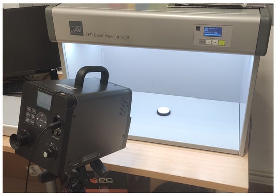 In order to represent and simulate different light sources in a virtual reality system, the first step is to obtain the spectral power distribution (SPD) of these light sources. For this purpose, we measured the SPD of the light sources of a real light booth in our laboratory.The measurements were performed employing our tele-spectroradiometer with a measurement geometry of 0°/45° over a Spectralon (Labsphere, Sutton, NH, USA), a diffuse reflectance standard with a Lambertian spectral reflectance of 99.9% in the visible range. Figure 4 shows the set up scenario used to obtain these spectral curves.