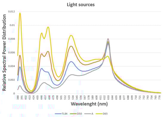 From an immersive image quality point of view in a virtual reality scenario, we have seen how numerous works have made great efforts in applying computer graphics techniques to improve the final rendering. Examples are ray tracing [,], eye tracking [] or zone-based rendering [,]. All these improvements make virtual reality systems more realistic [] but none of them are focused on color fidelity using different light sources. However, just as in the physical world the light source plays a determining role in the human visual system and in the way we perceive the color of objects, it also does so in virtual reality. Therefore, it is necessary to use advanced techniques such as the use of spectral information in the color texture assigned to a 3D object to create a feeling of similarity to reality [,].