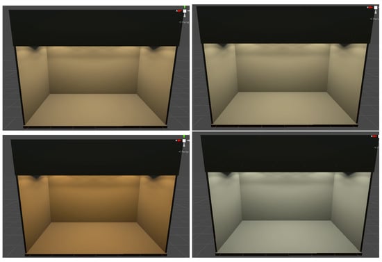 Different light sources represented in our virtual reality scene. TL84 (top left), D50 (top right), A (bottom left) and D65 (bottom right).