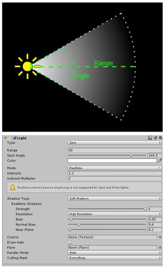 As for the illumination settings, a spot light type was used. Like a point light, a spot light has a specified location and range over which the light falls off. However, the spot light is constrained to an angle, resulting in a cone-shaped region of illumination. The center of the cone points in the forward (Z) direction of the light object. The light also diminishes at the edges of the spot light’s cone. By widening the angle the width of the cone is increased and this increases the size of this fade, known as the ‘penumbra’. To simulate the scenario most realistically, the illumination range and the angle of each spotlight of the physical light booth was measured. Figure 7 shows the operation of a Spot light and the screenshot of the settings used in Unity.