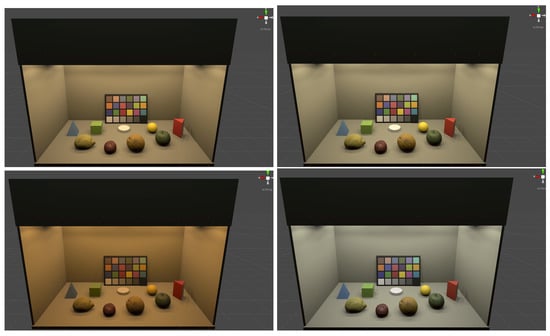 Screenshots of the final virtual scenarios using hyperspectral information and different light sources. TL84 (top left), D50 (top right), A (bottom left) and D65 (bottom right).