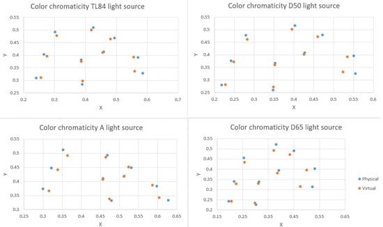 Once the physical measurements of the 10 randomly chosen NCS samples were taken, we entered the spectral reflectances provided by the manufacturer into our virtual reality system. Again, we repeated the same measurement procedure but this time directly on the HMD. This procedure is similar to the one used in the chromatic characterization measurements in Section 3.1 but, in this case, the RGB color assigned to the circular capsule came from the spectral color management system. With these new measurements, we have the CIE 1931 x,y chromaticities for the physical values and for the values measured in our virtual reality system. Figure 10 shows the comparison between physical and virtual samples under the four light sources studied.