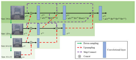 The encoder–decoder architecture of the serial Unet++ block. Compared to the original Unet++ model, we reduced the layers of the network from four to three for the consideration of less parameters and resolution of the input. The three-layer down-sampling structure reduces the image resolution to one eighth of the original size. Through the Unet++ structure, the features of different resolutions can be fully fused, which gives the model the ability to capture deep features and retain shallow features.