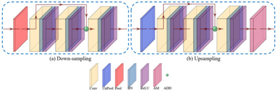 Moreover, in the Down-sampling operation, a convolutional module with ResNet [44] structure is used to replace the simple convolutional layer. As shown in Figure 3a, the Down-sampling operation contains three convolutional layers, and immediately after every convolutional layer are batch normalization (BN) and ReLU layers. To keep the gradient from dispersion, a residual learning strategy is introduced. The input features transferred from the upper encoder are pooled to half size and fed to the first two convolutional layers. Further information extracted by two series of convolutional, batch normalization (BN), and ReLU layers are then added to the input and sent to the next convolutional layer together. The structure of the Up-sampling operation is similar to that of the Down-sampling operation, as shown in Figure 3b, except that the pool operation is replaced by interpolation to restore the feature size to the original resolution. Through assigning different weight to different spaces and channels, the attention module at the bottom of the decoder helps to learn the uneven distribution of haze.