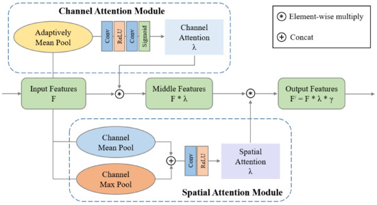 where is the input features of the attention module, and is the output features with channel attention and spatial attention. is the Sigmoid activation function and is the ReLU activation function. represents the adaptively mean pooling operation and means the concatenation in channel dimension. and mean max-pooling and mean-pooling operations, respectively.