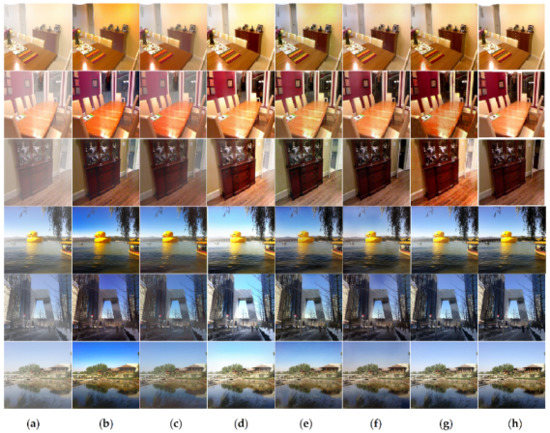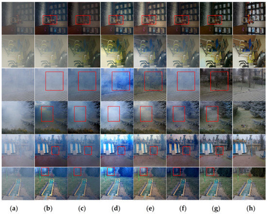 Specifically, as seen from Figure 5, the DCP method can achieve relatively soft visual performance, but in the face of areas with high brightness such as sky (the image in the first row) and wall (the image in the sixth row), it causes serious color distortion compared with ground truth. The convolutional module used in AODNet is at the same resolution, therefore its ability to characterize features is weak. AODNet’s dehazing performance is not thorough enough, which makes the images still present a hazy sense. The feature extraction module used in DCPDN comprehensively considers different resolutions, and multi-scale fusion is used in feature reconstruction. However, due to the error accumulation of parameter estimation in the atmospheric scattering model, DCPDN will bring obvious color distortion. This error is more obvious when the haze becomes thicker (see Figure 5d and Figure 6d). Although DCPDN has achieved good results in some images, there is still much color distortion that cannot be ignored, and a large amount of haze remains in some areas with high-density haze, such as the lower right area of the image in the third row. FDGAN and GCANet use more advanced feature extraction modules. The former uses a GAN network with a deep encoder–decoder structure, while the latter uses a gated fusion module to optimize the features extracted by encoder–decoder structure. FDGAN and GCANet perform well in the indoor dataset; however, the effect of dehazing is not ideal in the outdoor dataset, especially in the areas with obvious gradient changes, such as the junction of objects and the sky.