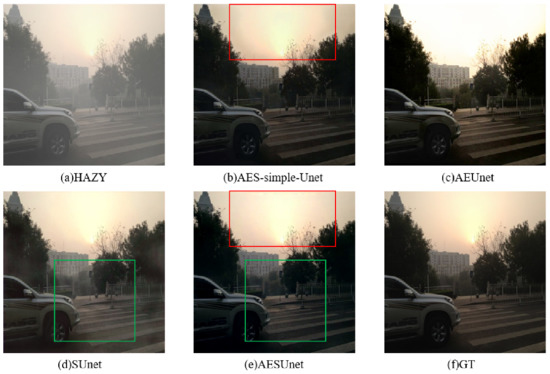 As shown in Table 3, the three factors can bring a significant improvement to the network. This promotion mainly comes from the mechanism of these factors rather than the stacking of parameters. In particular, the introduction of the attention module can bring more obvious performance improvement compared with the Unet++ structure. The performance improvement of serial strategy is greater than the first two. On the one hand, this is due to the positive impact of parameters; on the other hand, it is brought by feature fusion between shallow and deep layers. The results are also reflected in Figure 7. Due to the lack of short connections and more skip routes in the Unet++ structure, although more convolutional layers are added to extract features, the AES-simple-Unet also performs poorly in some regions compared with AESUnet. In the red box of Figure 7b, the color of the sky area around the sun is clearly divided into three layers, while, in Figure 7e, the color changes more naturally and smoothly. By comparison, as marked with the red box in Figure 7, the image generated by AESUnet is closer to the ground truth. The performance of AEUnet is the worst among the four models in the ablation study. It can be clearly seen from the Figure 7c that the color distortion in the sky area is very serious. This is because a single UNet++ block cannot capture deeper color information well to restore the original color. As for SUnet, because of the lack of attention module, the haze in the high-density areas is left on the image (marked with green box in Figure 7d), which seriously degrades the visual performance, and AESUnet can better take effect (marked with green box in Figure 7e).
