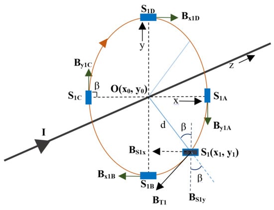 The magnetic field measurements can be considered by using the Cartesian coordinate system with the magnetic field components in the x, y, and z directions. Figure 1 illustrates a single-phase conductor with the magnetic field in the clockwise direction and a sensor, S1. This sensor is placed at a distance, “d”, from the center of the conductor at an angle of incidence, “β”. The magnetic field in the z-direction is parallel with the axis of the conductor or the current flow and can therefore be assumed to be negligible. Thus, at any angle of incidence, the magnetic field will only have two components, Bx and By. If it is assumed that the coordinates of S1 are (x1, y1) when the center of the conductor is at O(x0, y0), then the magnetic field that is sensed by the sensor at this location can be given as