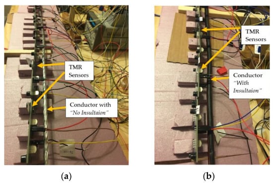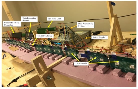 Recently, digital sensors that are based on advanced electronics such as Rogowski coils, Hall sensors, and digital fiber CTs have been researched in order to determine their application in current measurement processes [,,,,,,]. These sensors are a good replacement for conventional CTs, but they cannot be applied to a wide frequency range or higher magnitude AC currents. The recent discovery of magnetoresistive (MR) sensors has encouraged many researchers to explore alternative current measurement and fault detection methods [,,,]. The work that has been conducted in these studies does account for any of the effects resulting from the presence of conductor insulation on the magnetic field that can be sensed by the sensors. Research based on the application of sensors to high-voltage transmission lines [] has not covered the effect of various factors such as harmonics, the distance from the conductor, the sensor quality, and the effect of sag in long transmission lines as of yet. M. Shafiq et al. presented a study discussing electrical insulation diagnostics using magnetic sensors [] where the defects in the insulation were studied with the help of magnetic sensors. Moreover, these studies used basic MR sensors that had the design and manufacturing limitations of hysteresis and sensitivity. In this research, a NVE TMR sensor that has high sensitivity and that is capable of sensing an AC current of up to 300 A is used. The price of this sensor is lower than that of the conventional CTs and is comparatively the same as that of Halls sensors []. To validate the applicability of this sensor for current measurements, it is important to study its performance based on various aspects such as its ability to accurately sense the magnetic field from particular distances in the presence of additional frequencies other than 60 Hz as well as in cases where there are insulated cables and bare aluminum conductors. The calibration of the TMR sensor that is based on these factors will help to achieve the maximum accuracy in terms of current measurement. This objective can be accomplished by testing these sensors in an experimental setting. This paper focuses on the experimental validation, calibration, and analysis of the effect of various factors on the performance of sensors.