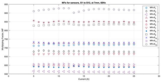To study the effect of sensor quality, it was determined that measurements would be taken for all of the sensors that were placed the distance that was the closest to the source and for the fundamental frequency of 60 Hz. The algorithm calculated the multiplying factors by using the DFT algorithm for each sensor and for each current value of 60 Hz that varied in peak value from 1 A to 25 A in steps of 1 A when the sensors were placed at a distance of 7 mm from the center of the conductor. Since the sensors have the capacity to measure up to 300 A, it was found that their sensitivity for 1 A current is very low. Therefore, it was decided the currents ranging from 5 A to 25 A would be considered for performance analysis. The multiplying factors that were obtained for the twelve sensors are shown in Figure 4. It is evident from this figure that each sensor has a different multiplying factor (MF) and that it varies from 565 to 921 for the same amount of source current. Three sensors, S6, S8, and S11, have MFs in that are in the close range from 590 to 616. Similarly, sensors S1, S4, and S10 show values that are close to each other and that are in the range from 716 to 738. Sensors S2 and S7 have MFs that are almost the same, with a variation of 15. Only sensor S12 showed a very high MFs value for all currents ranging from 5 A to 25 A, and the individual MFs for each current were less consistent compared to all of the other sensors. It is also evident from Figure 4 that the MFs become very consistent when there is less variation for the increasing value of current from 10 A onwards. It is therefore anticipated that all of the sensors will provide consistent performance for all of the magnetic fields that are generated by currents that are higher than 20 A.
