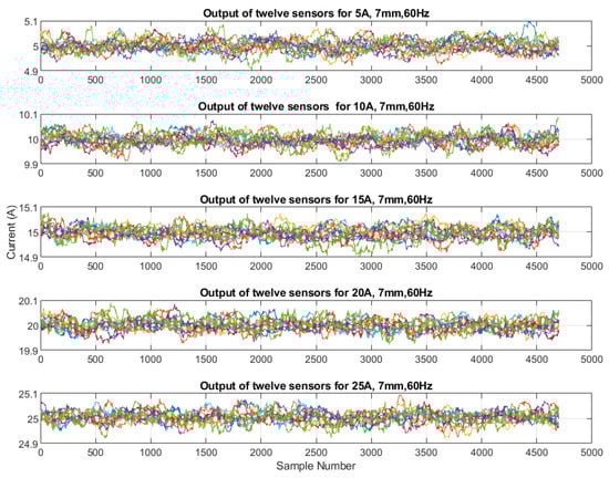 Output of all sensors for 5 A to 25 A for 7 mm, 60 Hz.